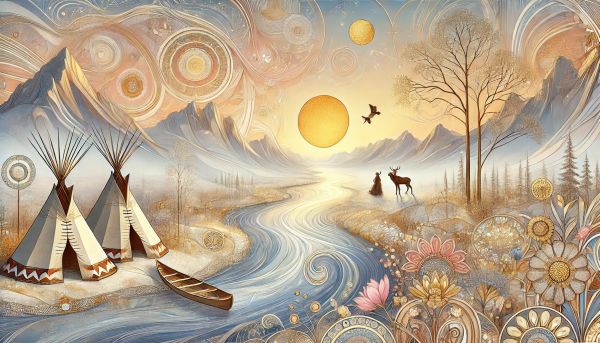 Bathed in the golden glow of the setting sun, the Sabine River becomes a magical expanse in this artful illustration. The smooth, flowing river mirrors the sky’s warm tones, winding through a mystical landscape where the natural and the fantastical blend effortlessly. Against a backdrop of silhouetted mountains, ornate floral patterns and fractal designs flourish across the scene, lending a dreamlike quality that captivates the viewer. Traditional tepees sit peacefully along the riverbank, hinting at the rich history and culture that have thrived alongside these timeless waters. A solitary canoe rests by the water's edge, symbolizing the journeys yet to be embarked upon. In the distance, a figure rides swiftly on a horse, their silhouette energized against the vibrant sky adorned with swirling celestial patterns and floating orbs. This visual narrative not only celebrates the beauty of the Sabine but also weaves a tale of harmony and enchantment amidst nature’s grandeur. ***About the Sabine River: *** The Sabine River runs through the southeastern portion of the United States, playing a vital role in the ecology and history of Texas and Louisiana. This river has been a crucial resource for agriculture, industry, and transportation. Over centuries, it has also served as a natural boundary and a source of contention and cooperation between the two states. Its banks have witnessed the comings and goings of different cultures, making it a significant symbol in both states' historical tapestries. The river's biodiversity contributes to its importance as a natural habitat, supporting a wide range of wildlife and plant species.