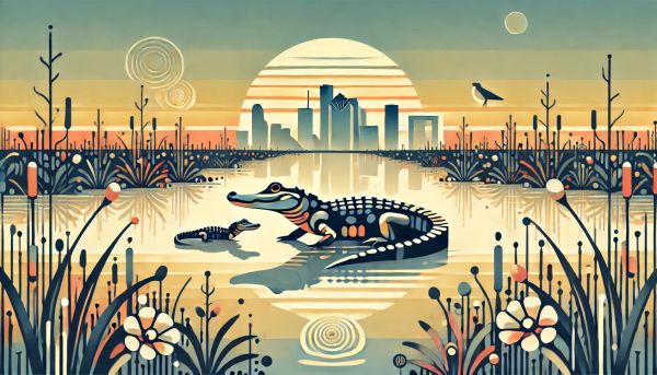 Bathed in the soft glow of sunrise, a mother alligator and her cub sit tranquilly in the Houston wetlands, encapsulated in a dreamlike tableau of light and color. The sky, painted in gradients of orange and blue, casts a gentle warmth over the scene, highlighting the geometric complexity of the cubist style in which the creatures are rendered. Their sharp, abstracted features contrast with the smooth surfaces of the water, creating a mesmerizing effect that draws the eye. In the background, the silhouette of Houston’s skyline rises, its skyscrapers barely discernible against the radiant backdrop of the rising sun. This artwork, with its harmonious blend of nature and urban elements, evokes a sense of peaceful coexistence. The foreground is rich with stylized flora, suggesting the lush diversity of the wetland ecosystem. Tiny details—like the concentric circles rippling on the water’s surface and the delicate blooms nearby—enhance the composition’s depth and texture, inviting viewers to pause and immerse themselves in this serene, otherworldly setting. *** About American Alligators: Native to the southeastern USA, American alligators are a fascinating species that have roamed the earth for millions of years, surviving natural changes and human impacts. Primarily found in freshwater rivers, lakes, swamps, and marshes, they play a crucial role in their ecosystem by maintaining the balance of their environment. The portrayal of these alligators in art not only raises awareness about their existence but also emphasizes the importance of wetland conservation. Observing their calm demeanor in the artwork, viewers can reflect on the resilience and beauty of these ancient creatures amidst the ever-changing landscapes around them.: