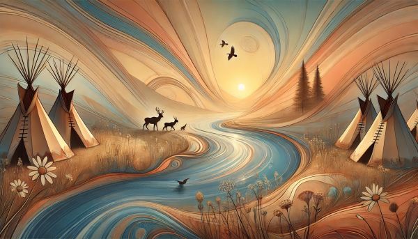 Bathed in the warm glow of a sunrise, the serene landscape of the Colorado River unfolds as an enchanting spectacle of ethereal beauty. Canvas teepees perched along the riverbank bask in the sun’s first rays, encapsulating the essence of tranquility and a deep connection to nature. The intricate, flowing lines of the river guide the viewer’s eye, mimicking the gentle curves of the distant hills. Above, a duo of birds dances across the sky, further pulling one into the artwork’s hypnotic rhythm. The presence of a moose family adds a touch of wilderness to the scene, grounding the lofty artistry in recognizable wildlife. Adding a fanciful element, whimsical flowers dot the landscape, lending a storybook quality to this picturesque tableau. The image is a masterpiece of minimalist illustration, where every swirl and shade not only captivates but also conveys the peaceful solitude one finds at dawn in such a majestic setting. *** About Teepees: Teepees, often recognized as tipis, are conical tents traditionally made of animal skins and wooden poles, used by the Indigenous peoples of the Plains in the United States and Canada. These structures are particularly noted for their portability and heat efficiency, making them ideal for nomadic lifestyles. Historically, teepees have been more than just functional dwellings; they are a symbol of the cultural identity and resilience of Plains Indigenous peoples. Masters of design, these structures reflect a deep understanding of environmental conditions and social needs.