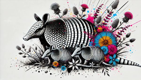 Title: Vibrant Armadillo Family in Stylized Houston Habitat Illustration