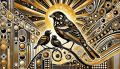 Sunrise Embrace: A Stylized Blue Jay Family Among Golden Gears