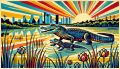 Stylized Sunrise in Houston with American Alligators and Cityscape