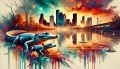 Surreal Alligator and Houston Skyline Fusion in Vibrant Artwork