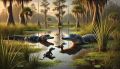 Mother and Baby Alligator in a Stylized Houston Swamp at Sunrise