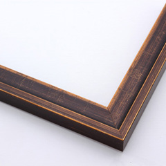This simple, stepped profile frame features solid wood overlaid with a blackened bronze foil.  This heavy antiquing gives the otherwise plain frame a classic look.